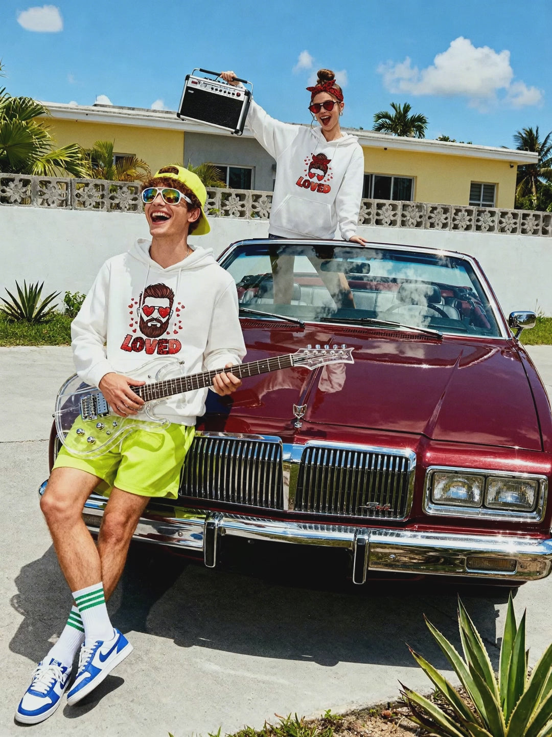 Aimed at fashion-forward couples, these hoodies offer soft 50% cotton-50% polyester fabric, unique “LOVED” retro character prints, attached hoods, long sleeves, and loose fit with excellent warmth. They bring a chic vintage-affection look, perfect for classic car dates or outdoor music events, making your love look effortlessly retro-chic.
